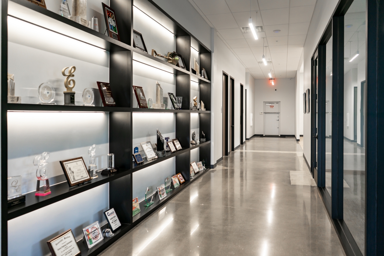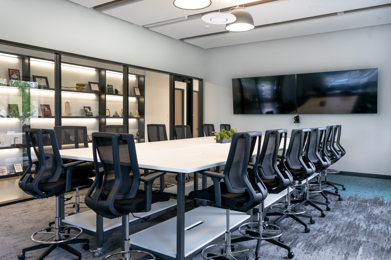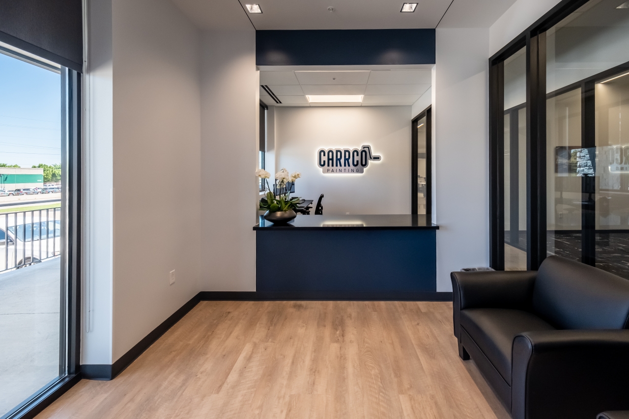 Carrco Painting’s headquarters project includes the interior finish-out of an existing 33,620-square-foot facility in Plano, Texas. Approximately 10,000 square feet of the space is dedicated to conditioned office areas, featuring a welcoming reception area, multiple conference rooms, private offices, restrooms, a break room, and a dedicated training room. Enhancing employee experience and wellness, the design also includes a fitness area with an integrated shower.