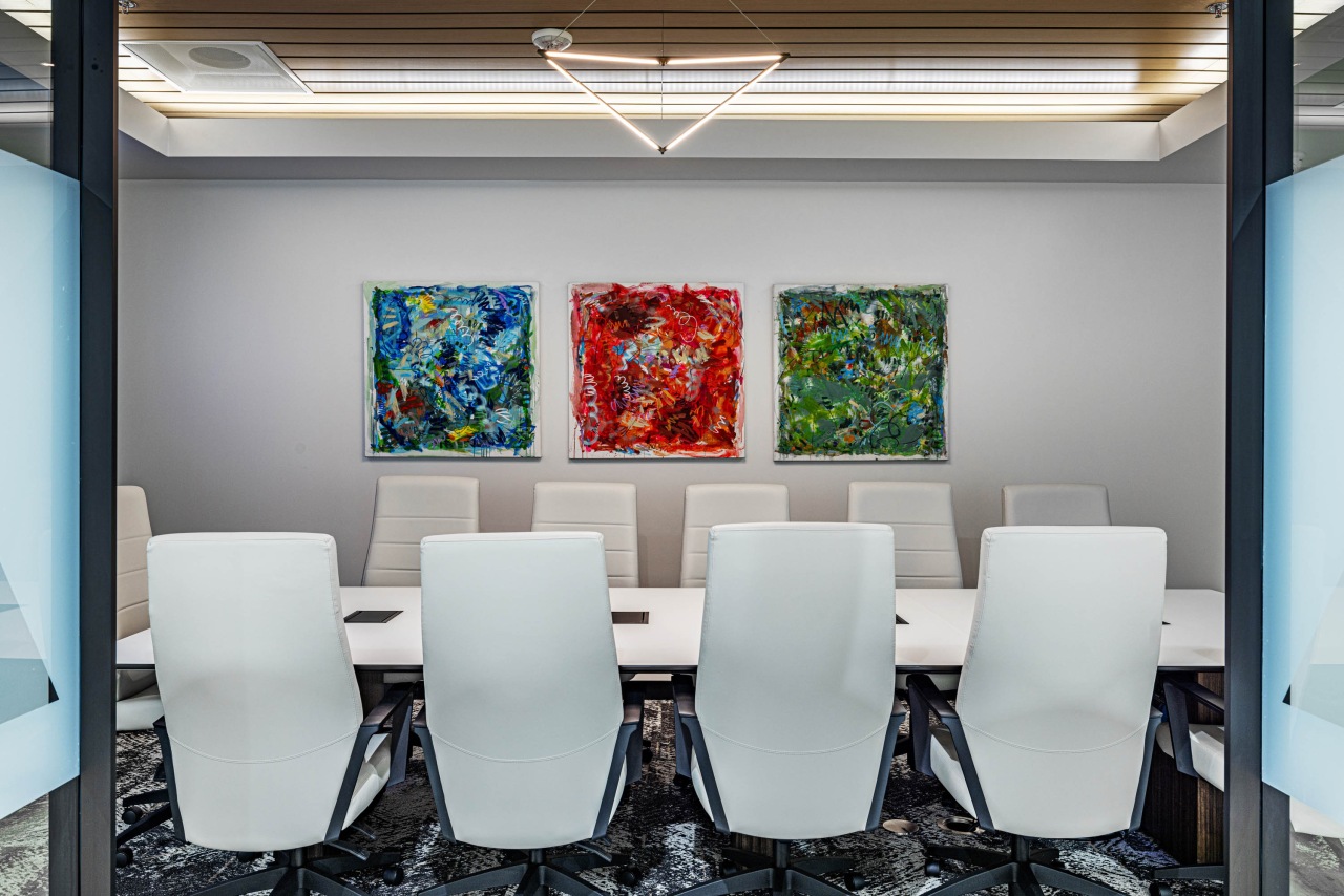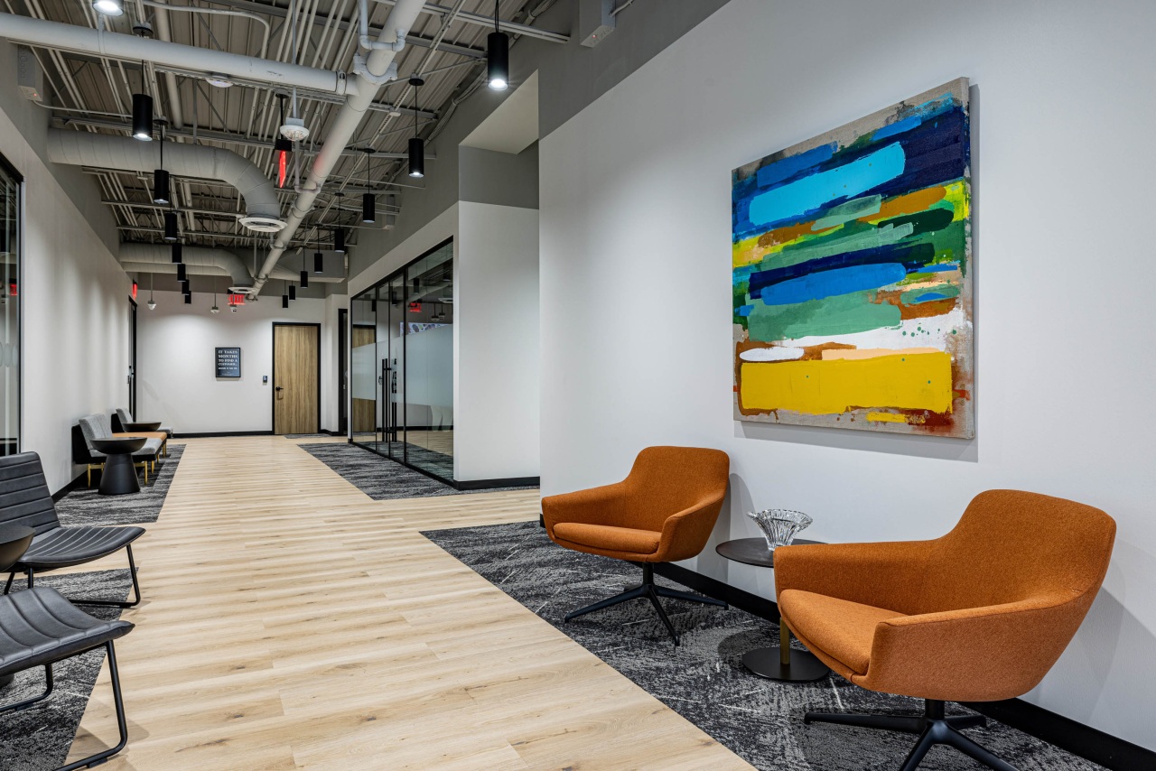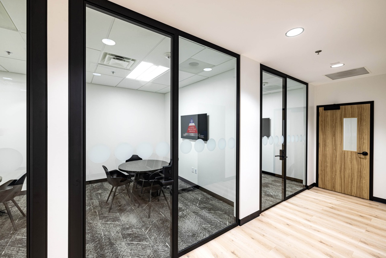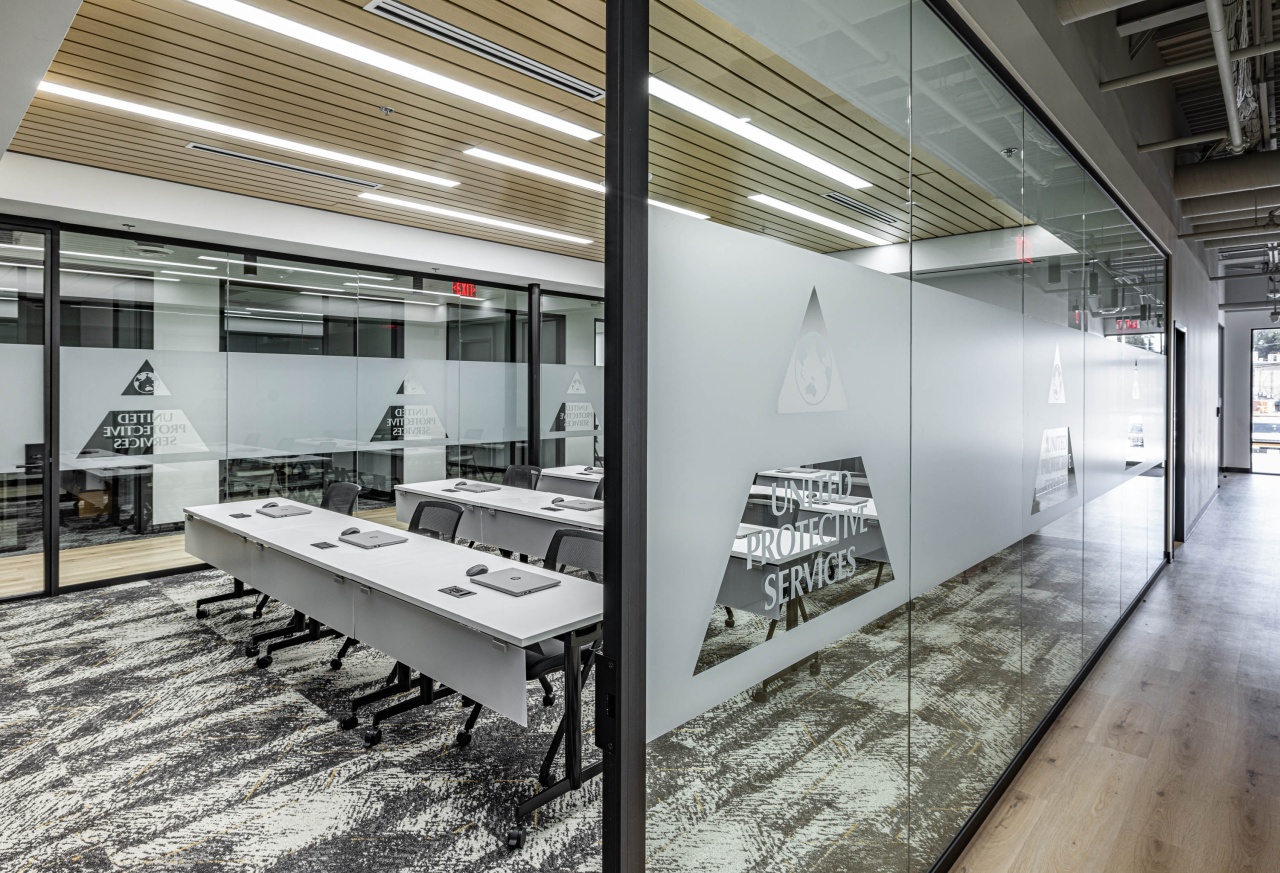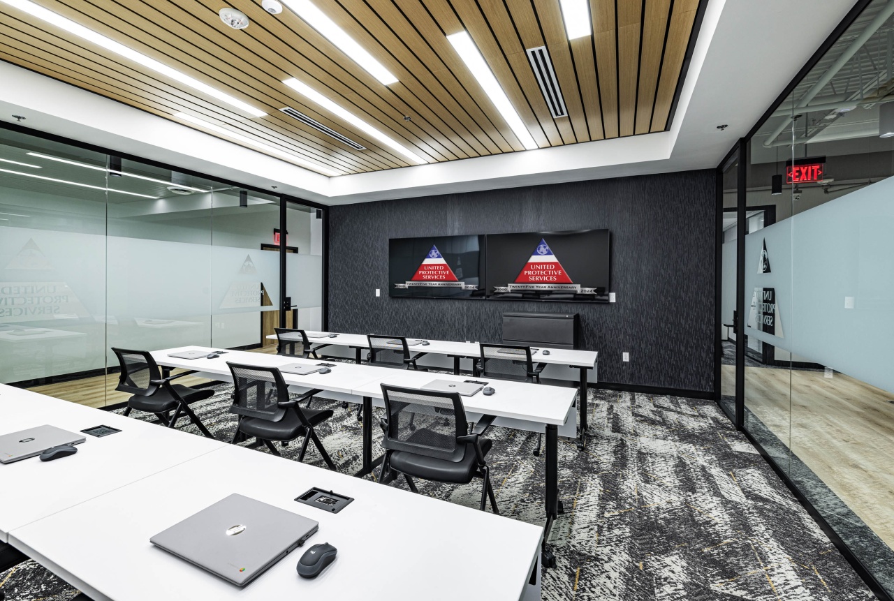 United Protective Services is a three-story tilt-wall building, spanning approximately 25,000 square feet, with 6,000 square feet dedicated to office space. The office features a blend of private workspaces and collaborative areas, including client meeting rooms and day-to-day operational spaces. The design maximizes natural light through new exterior windows and glass office fronts, while exposed ceilings and a light color palette enhance the feeling of openness. Private offices with acoustical separation ensure both privacy and comfort. Key elements include an elevated conference room with a wood slat ceiling and recessed lighting, a versatile glass-enclosed training room, and communal seating for employees and visitors.